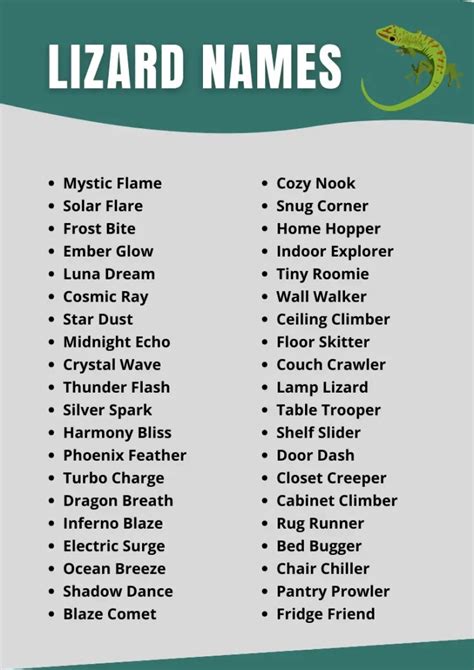 Find the perfect name for your lizard from this list of creative and unique ideas, tailored to your reptile’s personality. Find the perfect name for your pet lizard from this list of 1,000 unique, funny, and great names. We’d rather give you a.